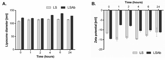 In another series of experiments, the stability of simvastatin immunoliposomes upon incubation with human plasma was determined. The experiments were performed as described in Materials and Methods (Section 4.6). After 6 h incubation of liposomes with 50% human plasma, the diameter of immunoliposomes increased from 120 nm to around 140 nm, but quite surprisingly, after 24 h it returned to its initial size (Figure 3A). Zeta potential of immunoliposomes increased after 1 h incubation with human plasma to almost half of its initial value, but then gradually decreased to reach a negative value close to the initial one (Figure 3B).