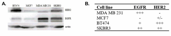 The level of both receptors, EGFR and HER2, was nearly undetectable in the MCF7 cell line. A high HER2 content was found in BT474 and SKBR3 cell lines whereas in MDA MB 231 the level of HER2 was undetectable. In contrast, the EGFR level was the highest in the MDA MB 231 cell line, slightly lower in SKBR3 and very low in the BT474 cell line (Figure 4). These results are in accordance with findings of other research groups.