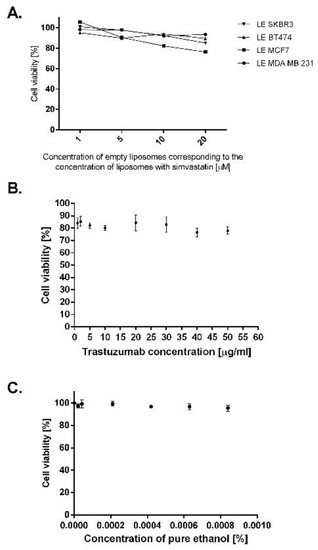 Toxicity of empty liposomal envelope towards tested breast cancer cell lines (A), toxicity of pure antibody (B) and toxicity of ethanol towards SKBR3 breast cancer cell line (C). Cells were treated with empty liposomes (A) and SKBR3 cells solely were treated with trastuzumab (B) or ethanol (C); viability of the cells was assessed by MTT assay.