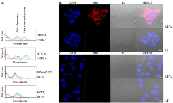 Selectivity of immunoliposomes interactions with different breast cancer cell lines. (A) Histograms for BT474, SKBR3, MCF7 and MDA MB 231 cells that were incubated with DiD(1,1’-dioctadecyl-3,3,3’,3’-tetramethylindodicarbocyanine)-labelled non-targeted liposomes or with DiD-labelled immunoliposomes for 30 min and 2 h. For BT474 and SKBR3 cell lines there is a significant shift to the right of the signal that is correlated with cells treated with DiD-labelled immunoliposomes (green line—30 min treatment, blue line—2 h treatment) in comparison to the signal obtained for cells treated with DiD-labelled non-targeted liposomes (yellow line—30 min, red line—2 h treatment). The shift of the signal was not observed for control cell lines. (B) Exemplary confocal images of BT474 breast cancer cells after 30 min of incubation with DiD-labelled immunoliposomes (top) and DiD-labelled non-targeted liposomes (bottom). (C) Exemplary confocal images of MDA MB 231 breast cancer cells after 30 min of incubation with DiD-labelled immunoliposomes (top) and DiD-labelled liposomes without antibodies (bottom). TL—transmitted light. Scale bar: 10 μm. Blue: nuclei stained with DAPI; Red: DiD-labelled immunoliposomes.