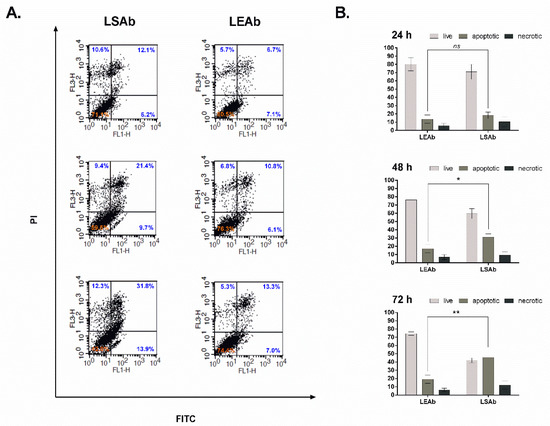 Determination of apoptosis/necrosis level after 24, 48 and 72 h of incubation with immunoliposomal form of simvastatin or control empty immunoliposomes (6.5 µM of simvastatin). SKBR3 cells were labelled with Annexin V-FITC and PI and analysed by flow cytometry. Quadrant legend: upper left—necrotic cells, upper right—cells in late apoptosis, lower left—viable cells, lower right—cells in early apoptosis. LSAb—immunoliposomes with simvastatin, LEAb—empty immunoliposomes. Statistical significance was determined on the basis of three independent experiments, by Student’s t-test, and differences were considered statistically significant at p < 0.05 (*), p < 0.005 (**), ns—not significant (p > 0.05). (A) Dot plots for SKBR3 cells treated with LSAb or LEAb; (B) Average number of live, apoptotic and necrotic cells after treatment with LSAb or LPAb. Data from three independent experiments.