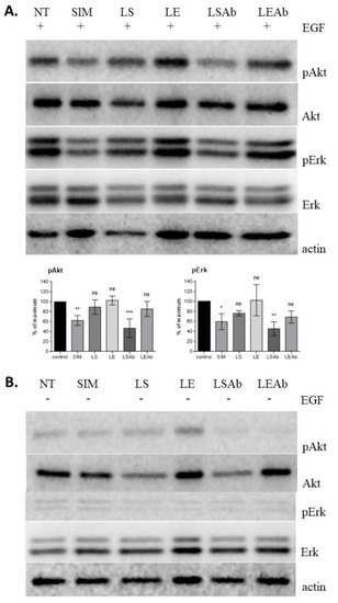 Levels of activation of Erk and Akt kinases in SKBR3 cells treated with simvastatin liposomes and simvastatin immunoliposomes. Cells were treated with liposomal forms of simvastatin for 24 h, and subsequently stimulated with EGF (100 ng/mL) for 15 min (A) or not stimulated (B), and then cell lysates were prepared and analysed by Western blot. NT: untreated cells; SIM: pure simvastatin; LS: non-targeted simvastatin liposomes; LE: non-targeted empty liposomes; LSAb: simvastatin immunoliposomes; LEAb: empty immunoliposomes. Statistical significance was determined on the basis of three independent experiments, by one way ANOVA with a post hoc Dunnett’s test, and differences were considered statistically significant at p < 0.05 (*), p < 0.005 (**), p < 0.0005 (***), ns: not significant (p > 0.05).