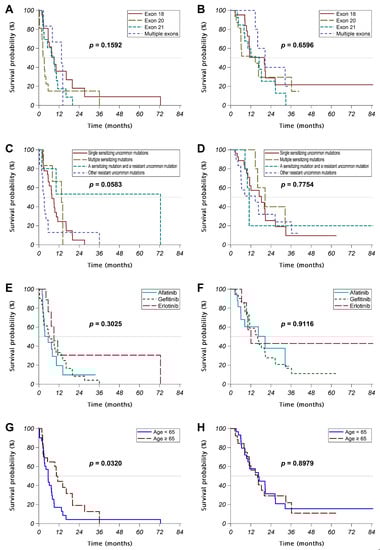 Kaplan-Meier curves of the progression-free survival (PFS) (A,C,E,G) and overall survival (OS) (B,D,F,H) of the patients receiving a first-line EGFR TKI, while classified the patients by (A,B) the exon of EGFR mutation, (C,D) the drug sensitivity of EGFR mutation, (E,F) the EGFR TKI used, and (G,H) the age group. Abbreviation: PFS = progression-free survival; OS = overall survival.
