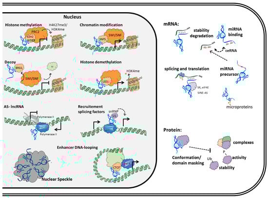 The function of lncRNAs in the cell. LncRNAs exert different functions in the nucleus, ranging from genomic DNA organization in speckle bodies, histone, and DNA methylation and direct transcriptional regulation (Section 2.1). Through their interaction with mRNA and function in miRNA regulation, they affect protein translation (Section 2.2). In addition, they interact with proteins, affecting stability, activity, and/or complex recruitment (Section 2.3).