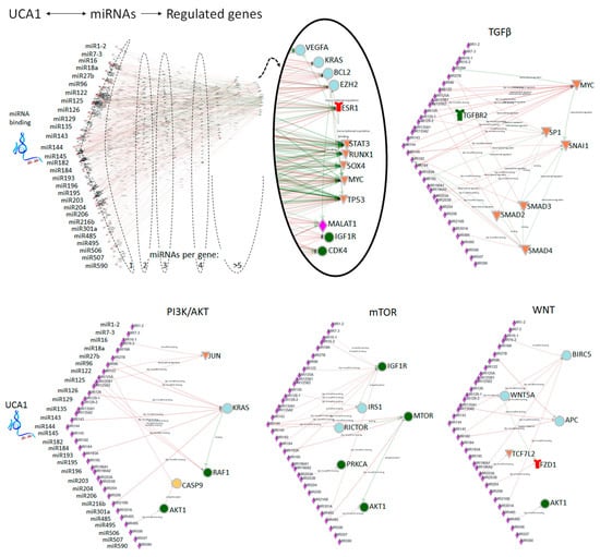 The regulation by Urothelial Cancer Associated 1 (UCA1)-associated miRNAs. All 29 miRNAs published to interact with UCA1 (Table 4) were submitted to the miRNA network analysis tool ONCO.IO and the downstream-regulated genes are visualized (https://onco.io/main.php). In the overall UCA1/miRNA image, genes were sorted based on the number of miRNAs bound per gene. The genes associated with over 5 miRNAs (circled) include VEGF, KRAS, BCL2, EZH2, receptor ESR1; transcription factors: STAT3, RUNX, SOX4, MYC, TP53; lncRNA MALAT; and the kinases IGF1R and CDK4. Genes that were associated with the indicated signaling pathways are also represented in individual images.