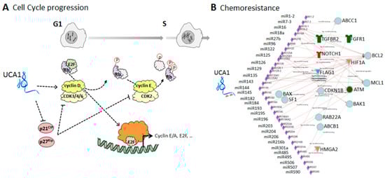 The UCA1-mediated regulation in colorectal cancer cells. (A) Schematically representation of UCA1 regulating key actors for cell cycle progression during G1 and S-phase in diverse cancer cell types. (B) All 29 miRNAs published to interact with UCA1 in diverse cancer cell types (Table 4) were submitted to the miRNA network analysis tool ONCO.IO and their interaction with chemoresistance-related genes were visualized (Receptors: TGFBR2, NOTCH1, FGFR1; Transcriptional regulating factors: HMGA2 and HIF1A; cell cycle kinase ATM, CDKN1 (p27); FLAG1, RAB22A, BAK1, BAX, ABCB1 (MDR1), ABCC1 (MRP1), MCL1, and BCL2).