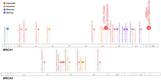 The average age of onset in BRCA1/2 carriers was 58.2 years (range: 27–87), with ten years of difference in diagnosis between BRCA1 and BRCA2 individuals (49.3 versus 59 years). All pathogenic variants identified in the BRCA1 and BRCA2 genes are displayed in Table 1 and Figure 1.
