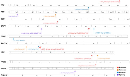- Kuusisto, K.M.; Bebel, A.; Vihinen, M.; Schleutker, J.; Sallinen, S.L. Screening for BRCA1, BRCA2, CHEK2, PALB2, BRIP1, RAD50, and CDH1 mutations in high-risk Finnish BRCA1/2-founder mutation-negative breast and/or ovarian cancer individuals. Breast Cancer Res. 2011, 13, e20. [Google Scholar] [CrossRef] [PubMed]