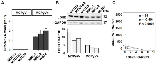 In this study, we investigated the relation between expression of miR-375 and LDHB, and their functional roles in MCC. We observed that LDHB expression was inversely correlated with miR-375 levels. Interestingly, LDHB was found to have distinct roles in MCPyV+ and MCPyV− MCC cells.