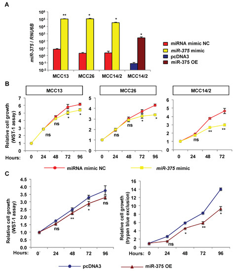 Over-expression of miR-375 reduces cell growth in MCPyV− MCC cell lines. MCPyV− MCC cells were transfected with miR-375 mimic or miR-375 OE and their respective negative controls. (A) Quantification of miR-375 in the transfected cells after 48 h of transfection or stable miR-375 OE-transfected cells of MCC14/2 by RT-qPCR. The relative expression of miR-375 was normalized to RNU6B and compared to miRNA mimic negative control (NC) or vector control (pcDNA3). (B) Evaluation of cell growth in cells transfected with miR-375 mimic and miRNA mimic NC at different time points using WST-1 assay. (C) Cell growth in stable miR-375 OE-transfected cell line was evaluated at different time points using WST-1 and trypan blue exclusion assays. Error bars are SEM from three independent experiments. * p < 0.05 and ** p < 0.01 by paired Student’s t-test. ns = not significant.