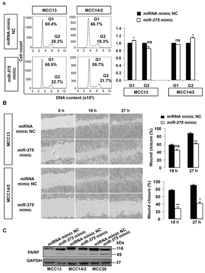 Over-expression of miR-375 reduces cell migration and induces cell cycle arrest and apoptosis in MCPyV− MCC cell lines. MCC13 and MCC14/2 cells were transfected with miR-375 mimic or miRNA mimic NC for 48 h. (A) Cell cycle analysis was evaluated in transfected cells by propidium iodide staining and flow cytometric analysis. Left panel: representative histograms illustrating the percentage of cells at G1 and G2 phases in cells with and without over-expression of miR-375. Right panel: Fractions of cells at G1 and G2 phases were calculated from the histograms of three independent experiments. (B) Cell migration was evaluated using wound-healing assay. Left panel: representative images of wound closure at 18 h and 27 h time points. Right panel: the wound closure was calculated based on the difference between wound gap at 18 h or 27 h and 0 h time point and normalized to viable cell number of transfected cells plated in parallel. (C) Apoptosis was evaluated after 48 h in MCC cells transfected with miR-375 mimic or NC using Western blot analysis of anti-PARP (BD Pharmingen), which recognizes the full-length (116 kDa) and apoptosis-associated cleaved (89 kDa) forms. GAPDH was used as a loading control. * p < 0.05 and ** p < 0.01 by paired Student’s t-test. ns = not significant.