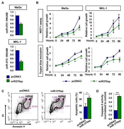 Inhibition of miR-375 reduces cell growth and induces apoptosis in MCPyV+ MCC cell lines. WaGa and MKL-1 cells were transfected with miR-375sp or vector control (pcDNA3) for 72 h. (A) RT-qPCR analysis of miR-375 levels in cells transfected with miR-375sp or pcDNA3. The miR-375 expressions were normalized to RNU6B. (B) Effect of miR-375 inhibition on cell growth was evaluated at different time points using WST-1 and trypan blue exclusion assays. (C) Representative flow cytometric images of WaGa cells co-stained with Annexin V-FITC and propidium iodide (PI) upon inhibition of miR-375. The apoptotic cells (Annexin V+/PI−) and the necrotic cells (Annexin V+/PI+) are represented in the lower and upper boxes, respectively. Quantification of the apoptotic cells is shown on the right panel. (D) Caspase-3 activity was quantified in WaGa cell lysates with and without inhibition of miR-375. Data are means ± SEM of three independent experiments. * p < 0.05, ** p < 0.01, and *** p = 0.001 by paired Student’s t-test. ns = not significant.