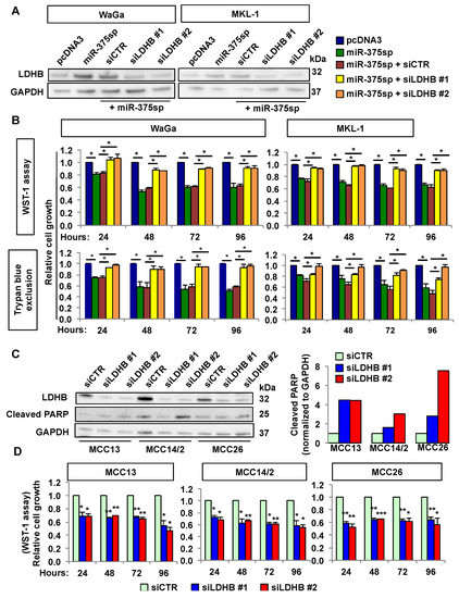 LDHB plays dual roles in MCPyV+ and MCPyV− MCC cells. (A,B) MCPyV+ MCC cell lines were transfected with miR-375sp or pcDNA3, or co-transfected with miR-375sp together with siCTR, siLDHB #1, or siLDHB #2. (A) Western blot analysis of LDHB in the transfected cells after 72 h of transfection. GAPDH was used as a loading control. (B) The effect on cell growth was evaluated at different time points using WST-1 and trypan blue exclusion assays. (C,D) MCPyV− MCC cell lines were transfected with siCTR, siLDHB #1, or siLDHB #2 for 48 h. (C) Western blot analysis of the effect of LDHB silencing on LDHB protein level and cleaved PARP. The specific 25 kDa cleaved form of PARP was detected using anti-cleaved PARP antibody (Abcam). Quantification of the cleaved PARP levels is presented on the right panel. (D) Effect of LDHB silencing on cell growth was evaluated using WST-1 assay. Mean ± SEM (n = 3). * p < 0.05, ** p < 0.01, and *** p < 0.001 by paired Student’s t-test.