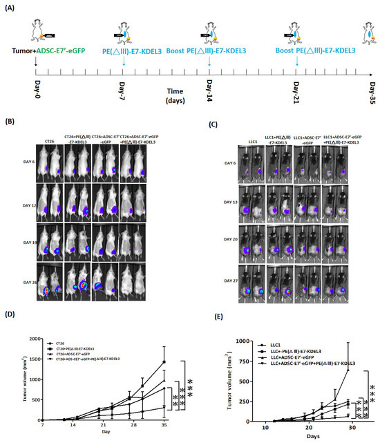 The tumor inhibition of the combined treatment by subcutaneously inoculated ADSC-E7’-eGFP and the protein vaccine. (A) Time course of the experiment. Representative bioluminescence images of mice subcutaneously injected with (B) 2 × 105 CT26 cells with indicated treatment or (C) 2 × 105 LLC1 cells with indicated treatment. Tumor volume measurements of syngeneic tumor models were conducted at indicated days after subcutaneous injection of (D) CT26 cells or (E) LLC1 cells; ** p < 0.01; *** p < 0.001 using two-way ANOVA.