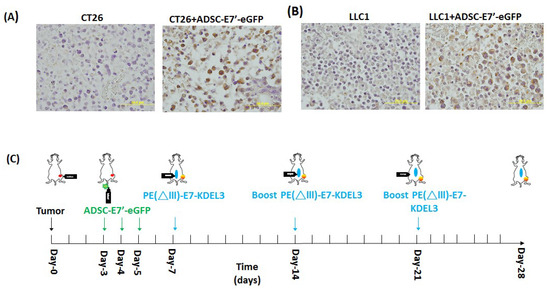 All animal studies were approved by The Institutional Animal Care and Use Committee (IUCAC) of Taipei Medical University (Approval no. LAC-2014-004; 16 January 2014). Six-week-old female BALB/c and female C57BL/6 mice were purchased from the National Laboratory Animal Center and the National Applied Research Laboratories (Taipei, Taiwan). The mice were housed under pathogen-free conditions and fed autoclaved food and water. Tumor xenografts were established by subcutaneous injection of 2 × 105 LLC1 cells or 2 × 105 CT26 cells. ADSCs were administered by subcutaneous co-inoculation with cancer cells at the same time, or by intravenous injection 3 days later. Mice were first immunized with the PE(ΔIII)-E7-KDEL3 protein vaccine 7 days after tumor inoculation, and received boost shots 1 and 2 weeks later.