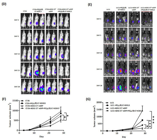 2.2. ADSC-E7’-eGFP–PE(ΔIII)-E7-KDEL3 Combined Treatment Inhibits the Tumor Growth of Colon and Lung Cancer Cells in Mice