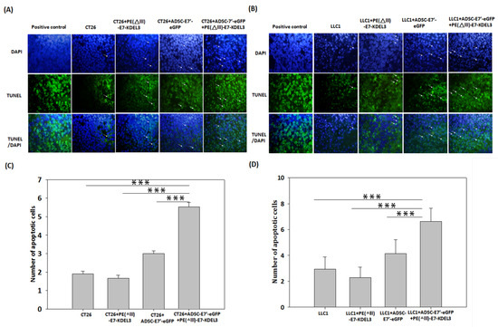 Tumor inhibition is caused by several events, including cell cycle arrest, cell apoptosis, anti-angiogenesis, and immunosurveillance. To determine whether apoptosis is involved in the inhibitory effect, on tumors, of the systemically administered combined treatment of ADSC-E7’-eGFP with PE(ΔIII)-E7-KDEL3, a TUNEL assay was conducted after 28 days of CT26 and LLC1 inoculation. Representative fluorescence images show that the ADSC-E7’-eGFP–PE(ΔIII)-E7-KDEL3 combined treatment group presented more apoptotic cells (green) than other groups, in both CT26 and LLC1 tumors (Figure 4A,B). Quantitative results demonstrated that, in both cancer types, the number of apoptotic cells was significantly higher in ADSC-E7’-eGFP–PE(ΔIII)-E7-KDEL3 combined treatment than that in other groups (Figure 4C,D). The ADSC-E7’-eGFP–PE(ΔIII)-E7-KDEL3 combined treatment showed a 2- to 3-fold increase in apoptosis compared to control group, which imply that apoptosis induced by the combined treatment may contribute to tumor inhibition.