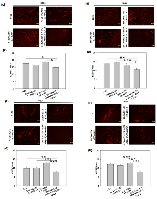 To determine whether angiogenesis is also involved in the antitumor effect of the systemically administered combined treatment of ADSC-E7’-eGFP with PE(ΔIII)-E7-KDEL3, the endothelial cell marker CD31 and vascular endothelial cell growth factor (VEGF) were detected 28 days after tumor inoculation. The tumor sections were stained and observed under fluorescent microscope (Figure 5A,B and Figure 5E,F). The results quantitatively revealed that both the CD31 and VEGF expression of the ADSC-E7’-eGFP–PE(ΔIII)-E7-KDEL3 combined treatment groups were significantly lower than the other single treatment or control groups (Figure 5C,D and Figure 5G,H), suggesting that the tumor regression induced by the combined treatment might be due to the inhibition of angiogenesis.