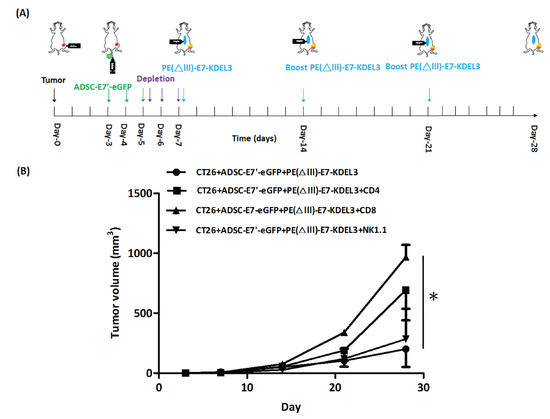 In vivo antibody depletion reduces the antitumor effect of the ADSC-E7’-eGFP–PE(ΔIII)-E7-KDEL3 combined treatment. (A) Time course of the experiment; (B) tumor volume measurements of syngeneic tumor models with different treatments were conducted at indicated days after the subcutaneous injection of CT26 cells; * p < 0.05 using two-way ANOVA.