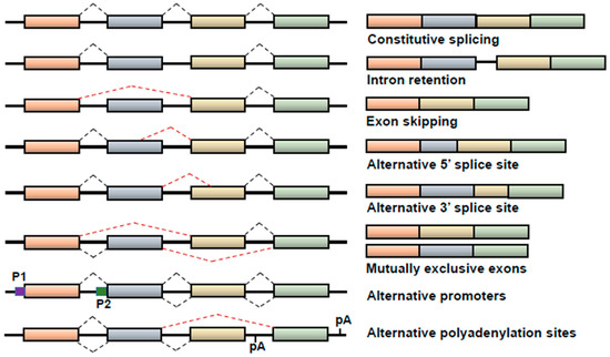 Different modes of alternative RNA splicing. Different modes of alternative splicing (AS), including constitutive splicing, intron retention, exon skipping, alternative splice site selection (5′ and 3′), mutually exclusive splicing, alternative promoter selection and alternative polyadenylation sites [19,20]. The pre-mRNAs are shown on the left panel, and the mature mRNA variants following AS are shown on the right panel.