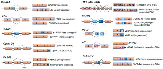 Alternative splicing events in cancers. Examples of aberrant splice variants and oncogenic consequences for Bcl-xL, FAS-S, p21H-RAS, Cyclin D1b, CASP-2S, TMPRSS2-ERG+72bp, FGFR2-IIIc, VEGF-165, AR-V7 and KLF6-SV1 [20,43,47]. Abbreviations: TMPRSS2–ERG+72bp, TMPRSS2–ERG fusion transcript with inclusion of a 72-bp exon [48]; BCa, breast cancer; PCa, prostate cancer; CE3, cryptic exon 3. Overexpression of splice variant TMPRSS2–ERG+72bp has been correlated to aggressive prostate cancer with poor clinical outcome [49]. The pre-mRNAs are shown on the left panel, and the mature mRNA variants (only the exons surrounding the differential splicing event are shown) following AS are shown on the right panel.