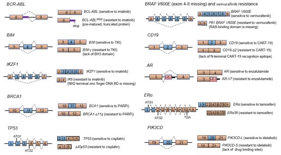 Aberrant mRNA splice variants in cancer drug resistance. AS events involving oncogenes, BCR-ABL, BIM, IKZF1, BRCA1, TP53, BRAF, CD19, AR, ER and PIK3CD, leading to resistance to targeted therapies, chemotherapy, hormone therapy or immunotherapy [121,122,123,124,125,126,127]. ATG1: Start codon for full-length TP53 and ERα. ATG2: Start codon for ∆40p53 and ERα36 splice variants. TGA: Stop codon for ERα36 splice variant. See text for additional references.