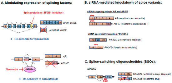 Different re-sensitization approaches to reverse RNA splicing events causing drug resistance. (A) Top panel: SiRNA-mediated knockdown of oncogenic splice variants. SiRNAs targeting exon 1of AR-V7 variant. Bottom panel: SiRNA targeting the junction of exons 19 and 21 to specifically inhibit expression of PIK3CD-S. (B) Splice switching oligonucleotides (SSO) as a strategy to interfere with aberrant splicing. Example illustrated is an SSO (or splice switching anti-sense oligonucleotide, ASO) bound to the intron-exon junction to prevent splice generation of the MKNK2-2b variant, thereby re-sensitizing cancer cells to drug treatment. (C) Pharmacologic inhibition of splicing factors. Spliceostatin A (SF3B1 inhibitor) and quercetin (HNRNPA1 inhibitor) suppress formation of p61 BRAF V600E and AR-V7 splice variants, respectively. These approaches will induce re-sensitization of cancer cells to drug treatments. See text for corresponding references.