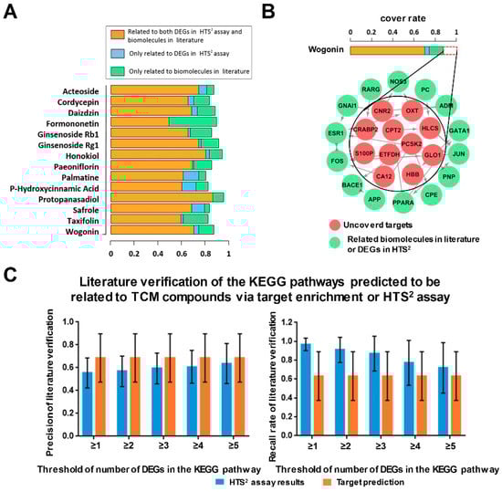 Evaluation of the target prediction results based on the literature and the HTS2 assay results. (A) The ratio of the predicted targets of the TCM compounds covered by the literature and the assay results. The cover rate was calculated as . (B) Some targets of wogonin, which were not related to biomolecules in the literature or the DEGs in the HTS2 assay, were in the same pathway or connected via the protein–protein interaction (PPI) in STRING with the biomolecules in the literature or the DEGs in the HTS2 assay for wogonin. (C) Literature verification of the KEGG pathways related to the TCM compounds for cancer treatment with target enrichment and HTS2 evidence. Error bars represent the precision and recall rates of different TCM compounds. The precision was . The recall rate was . Data represent mean ± SD.