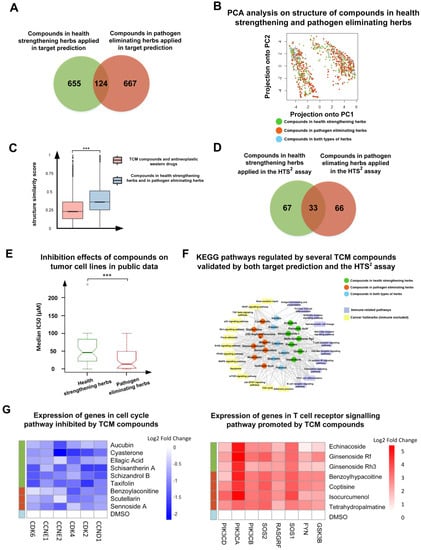 An overview of types of TCM applied in the research on their structures, inhibitory effects on tumor cells, and regulated bioactivities, based on public data, target prediction, and the HTS2 assay. (A) The number of compounds in the two types of TCM herbs in cancer treatment applied in the target prediction. (B) PCA analysis on structure of compounds in the two types of herbs in cancer treatment. (C) The structure similarity comparison between the compounds from health-strengthening herbs and pathogen-eliminating herbs and that between the TCM compounds and antineoplastic Western drugs via Tanimoto coefficients. Data represent median ± interquartile range. Statistical analysis was performed using a Kolmogorov–Smirnov (KS) test. *** p < 0.001. (D) The number of compounds from the two types of TCM herbs applied in the HTS2. (E) The inhibitory effects of compounds in the two types of herbs on proliferation of tumor cell lines in public bioactivity databases. Data represent median ± interquartile range. Statistical analysis was performed using a Wilcoxon rank sum test. *** p < 0.001. (F) The regulated immune and cancer hallmarks (immune-excluded) pathways of several TCM compounds supported using target prediction and the HTS2 assay. (G) Expression data of several genes in the cell cycle and T cell receptor signaling pathways after TCM compound treatments.