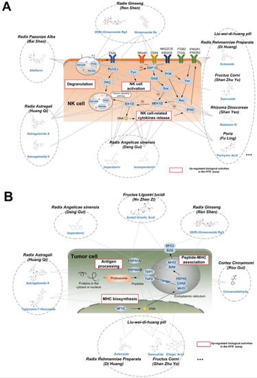 NK cells recognize and kill tumor cells containing the mutated gene fragments [47]. In the tumor environment, the NK cell activity is inhibited by the biological function of the tumor cells [48]. In Figure 3A, some TCM compounds from health-strengthening herbs with the potential biological functions of promoting NK cell activity were listed at the top, as indicated by the HTS2 assay results. For instance, ginsenoside Re, a compound in Radix Ginseng (Ren Shen), was suggested to exert an NK cell activation effect by upregulating the expression of genes involved in degranulation and NK cell-related cytokines release.