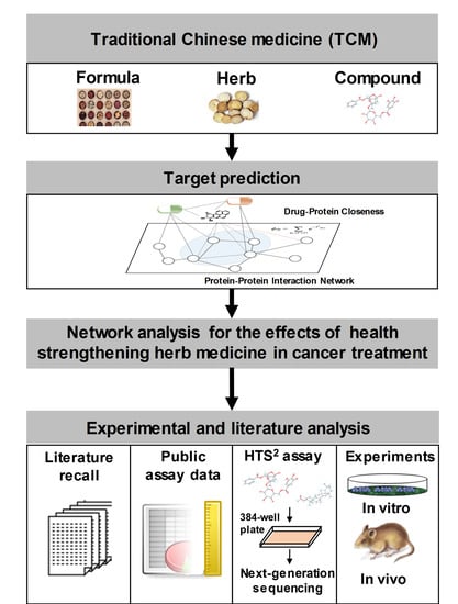 Traditionally, TCM adopts a relative and holistic point of view in cancer treatment. The clinical treatment strategy by strengthening health reflects the characteristics of focusing on regulatory effects instead of the antagonistic effects of TCM, and embodies the classical therapeutic theory that “pathogenic-qi cannot invade the body if health-qi remains strong” in the Canon of Internal Medicine (Huangdi Neijing). Therefore, an in-depth exploration on the antitumor effects exerted by health- strengthening herbs is meaningful and urgently needed. TCMs in the Chinese national medical insurance catalogue (2017) for oncology treatment are officially divided into two categories, including antitumor TCM and adjuvant TCM for tumors, which contain 40 TCM prescriptions in total [7]. Additionally, some health-strengthening prescriptions are widely applied in cancer treatment, such as Sijunzi decoction in colorectal cancer [8], Shenqi Fuzheng injection in colorectal cancer and breast cancer [9,10], Shenling Baizhu San in gastric cancer [11], and Buzhong Yiqi decoction in colorectal and lung cancer [12,13]. The wide application and the distinctive therapeutic strategy of health-strengthening herbs have given rise to the growing research interests in the investigation on the effects and the underlying mechanisms of health-strengthening herbs in cancer treatment. A large amount of research effort has been put into the studies on the biological basis of health-strengthening TCM from a variety of perspectives, such as their immune and metabolic regulatory effects. For example, previous studies on various health strengthening formulae (e.g., Shenqi Fuzheng injection, Danggui Buxue decoction, Huangqi Jianzhong decoction, and Liu-wei-di-huang pill) revealed their protective effect on immune functions in cancer therapy [14,15,16,17]. Metabolic regulatory function is also involved in the antitumor effects of health-strengthening formulae, suggested by the pharmacological studies on the Liu-wei-di-huang pill, Jianpi Yiqi decoction, and Yishen Gukang decoction [17,18,19]. Considering the situation that more studies emphasize the immune regulatory effects of health strengthening herbs, in this study, we took the immunological effects of health strengthening herbs as an example to explore the commonness in their biological basis of in cancer treatment. Despite the great efforts in the research field, the understanding of the antitumor mechanism of health-strengthening medicine is not clear enough [20,21]. The solution is constrained by the following three interrelated factors: the complex composition of TCM, the lack of target information of TCM, and the complex biological system involved in cancer development. To further promote the application of TCM in the treatment of cancer, proposing a comprehensive analysis strategy for exploring the impact of TCM from a holistic point of view is urgently needed.