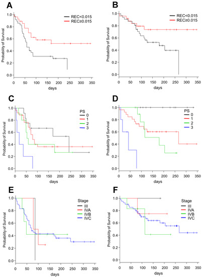 The univariate analysis (Table 2) showed that PS ≥ 3, RNC ≥ 0.65, RLC ≥ 0.17, and REC ≥ 0.015 were significantly associated with both PFS and OS, whereas CRP ≥ 1.0 and Albumin (Alb) ≥ 3.5 were significantly associated with OS only. Conversely, LDH ≥ 240, chemotherapy line ≥ 3, and age ≥ 70 years did not significantly affect PFS or OS. No significant difference was observed between oropharyngeal cancers, which are often associated with human papilloma virus (HPV), and tumors of other anatomical regions. The Kaplan–Meier curves stratified by REC and PS are shown in Figure 2. On multivariate analysis (Table 3), PS ≥ 3 (p = 0.0008; HR 6.38, 95% CI 2.14–18.98) and REC ≥ 0.015 (p = 0.02; HR 0.31, 95% CI 0.13–0.71) were significantly associated with PFS, whereas PS ≥ 3 (p = 0.0002; HR 22.35, 95% CI 4.40–113.40), REC ≥ 0.015 (p = 0.04; HR 0.27, 95% CI 0.08–0.92), and CRP ≥ 1.0 (p = 0.04; HR 3.72, 95% CI 1.09–12.73) were significantly associated with OS.