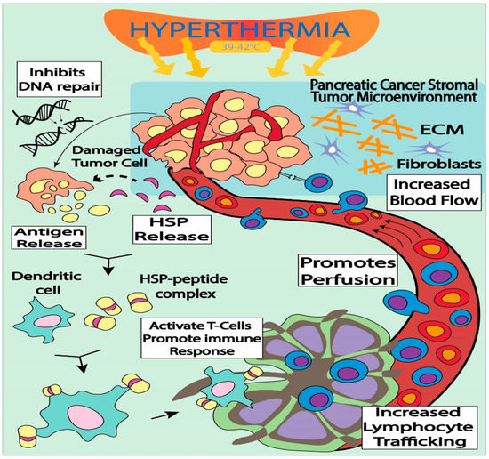 Hyperthermia (HT) has been employed as a beneficial modality in treating human cancer. Elevated body temperature has been linked to activate the immune system against tumor cells. Normally, HT treatment is provided by heating the targeted tumor site, increasing its temperature to between 39–43 °C for 30–60 min. Interestingly, during HT, normal tissue has the ability to endure the mild temperature while cancer cells are sensitive to temperature stress and succumb to death [43]. Tumor-targeted HT induces and overexpresses a variety of heat shock proteins (HSPs), which can potentially increase tumor antigenicity [11]. For HT therapy, the tumor is heated up to between 39 to 43 °C, and the elevated temperature can alter the pathophysiology of the cancer cells by enhancing oxygenation of the surrounding TME and blood flow to the tumor [44]. It is well known that HSPs play an active role in antigen recognition in dendritic cells, and that transporting HSP bound antigenic peptides to MHC I molecules results in the triggering of antigen-specific T-cell activation [45,46,47,48]. A well-known HSP60 chaperone protein is involved in antigen dependent T-cell activation that allows IFN-γ secretion and T-cell activation [49]. Interestingly, it has also been observed that HT also upregulates HSP70 chaperone protein, which could play an important role in provoking an immune response against tumor propagation. It is also evident that HSPs play an important role as carriers of tumor derived antigens and could serve to activate antitumor immune responses [50,51]. Thus, further investigations on the key roles of HSPs are required to precisely explore their synergistic role in HT, and their role in antigen presentation among T-cells and dendritic cells during HT treatment (Figure 1) [44]. Recent preclinical investigations have also demonstrated that HT stimulates cytokine production by enhancing T-cell membrane flexibility [52]. In a recent preclinical model, it has been demonstrated that T-cell membrane fluidity leads to an organized interaction between T-cells and APCs, which triggers important signaling pathways at the junction of APC and NK cells [53]. In addition, the hyperthermal effect increases permeability of tumor cells, leading to enhanced immunotherapy drug diffusion, simultaneously alleviating drug resistance in tumor tissues and inhibiting DNA repair in PC patients following RT [54]. Moreover, this therapy has the potential to avoid drug resistance due to a higher blood flow in tumor tissues that could result in a relative increase in immunotherapeutic drug concentration within the tumor (Figure 1).