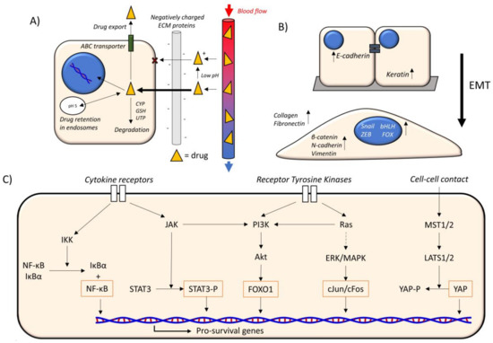 Mechanisms of chemoresistance. (A) Drug availability. Drugs (yellow triangles) move from blood vessels (right) to cells. A low pH can promote charged drugs that interact with negatively-charged extracellular matrix (ECM) components (grey), slowing their transit. Charged drugs are also hindered in their ability to cross the hydrophobic plasma membrane. Inside the cell, drugs can move to the nucleus to achieve their cytotoxic effects. Alternatively, drugs can be transported out of the cell by ABC transporters, and degraded by the cytochrome P450 system (CYP), glutathione-S-transferase (GSH) superfamily or uridine diphospho-glucuronosyltransferase (UGT) superfamily. Drugs also enter endosomes, and charged drugs are retained more within these acidic vesicles. (B) EMT. The epithelial–mesenchymal transition (EMT) involves the loss of cell–cell adhesion from the epithelial phenotype (above) to the mesenchymal phenotype (below). E-cadherin and keratin are more abundant in the epithelial phenotype. β-catenin, N-cadherin, and vimentin, and the transcription factor families Snail, ZEB, bHLH, and FOX, are more abundant in the mesenchymal phenotype. Collagen and fibronectin secretion is also increased in the mesenchymal phenotype. (C) Oncogenic signaling pathways. The main oncogenic signaling pathways that lead to the expression of pro-survival genes. Cytokine receptors promote NF-κB and STAT signaling, receptor tyrosine kinases promote PI3K and MAPK signaling, and cell–cell contact inhibits YAP signaling (Hippo pathway). The orange outline indicates a component that is involved directly in promoting transcription. IKK = IκB kinase, NF-κB = nuclear factor kappa-light-chain-enhancer of activated B cells, IκBα = inhibitor of kappa B, JAK = Janus kinase, STAT3 = Signal transducer and activator of transcription 3, STAT3-P = phosphorylated STAT3, PI3K = Phosphatidylinositol-4,5-bisphosphate 3-kinase, Akt = protein kinase B, FOXO1 = forkhead box protein O1, ERK/MAPK = mitogen-activated protein kinase, MST1/2 = mammalian ste20 homolog 1/2, LATS1/2 = large tumor suppressor kinase 1/2, YAP = Yes-associated protein, YAP-P = phosphorylated YAP. Dotted arrow = multiple reactions.