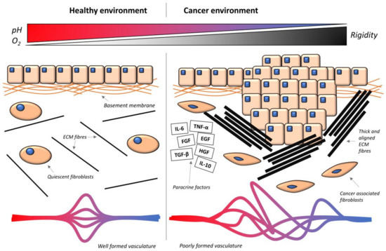 Comparison between the healthy and the cancer microenvironment. In the healthy environment, epithelial cells are separated from the stroma below by the basement membrane. In the stroma, fibroblasts show their quiescent phenotype, and there is a low abundance of ECM fibers (black), and therefore reduced rigidity. The vasculature is highly organized, and there is a high level of oxygen and a neutral pH. In the cancer environment, excess cell growth leads to breaching of the basement membrane, and cells are in contact with the stroma. Cancer-associated fibroblasts (CAFs) become activated, and there is a high abundance of ECM fibers and growth factors (black outlined rectangles). TNF-α = tumor necrosis factor alpha, IL-6 = interleukin 6, IL-10 = interleukin 10, EGF = epidermal growth factor, FGF = fibroblast growth factor, HGF = hepatic growth factor, TGF-β = transforming growth factor beta. The vasculature is excessive but poorly organized, and oxygen and pH are reduced. Stromal rigidity is increased.