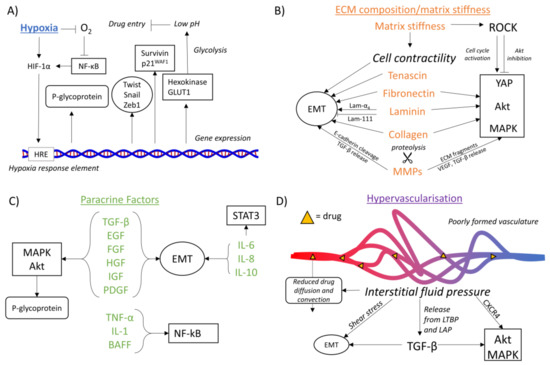 Effects of the microenvironment on mechanisms of chemoresistance. (A) Hypoxia. A lack of oxygen leads to the stabilization of HIF-1α (hypoxia inducible factor 1 alpha), either directly or through NF-κB-mediated (nuclear factor kappa-light-chain-enhancer of activated B cells) gene expression. HIF-1α binds to the hypoxia response element (HRE), upregulating P-glycoprotein (drug availability), the transcription factors Twist, Snail, and Zeb1 (EMT) and survivin and p21WAF1 (cyclin-dependent kinase inhibitor 1) (oncogenic signaling). Also upregulated are hexokinase and GLUT1 (glucose transporter 1), which promote glycolysis, leading to a reduced external pH and inhibition of drug entry. (B) ECM composition and matrix stiffness. The ECM proteins tenascin, fibronectin, laminin, and collagen all affect the EMT (epithelial–mesenchymal transition), although different laminin α chains have different effects. Fibronectin, laminin, and collagen also modulate the oncogenic signaling pathways of YAP, Akt, and MAPK. MMPs (matrix metalloproteinases) act to release paracrine factors such as TGF-β, which regulates both EMT and oncogenic pathways. In addition, MMPs can cleave E-cadherin to promote EMT and ECM fragments to promote oncogenic pathways. Matrix stiffness promotes cell contractility, which leads to EMT, as well as promoting Rho-associated coiled coil-containing protein kinase (ROCK) activation, which has differing effects on oncogenic pathways. (C) Paracrine factors. The factors TGF-β, EGF, FGF, HGF, insulin-like growth factor (IGF), and platelet derived growth factor (PDGF) both promote EMT, and the MAPK and Akt pathways. MAPK and Akt also activate P-glycoprotein. Interleukins 6 and 8 promote STAT3 signaling and EMT. TNF-α, IL-1 and B cell-activating factor (BAFF) promoter NF-κB signaling. (D) Hypervascularization. The interstitial fluid pressure generated by hypervascularization can promote EMT through shear stress, oncogenic signaling pathways through C-X-C chemokine receptor type 4 (CXCR4) activation, and TGF-β release, which promotes EMT and oncogenic pathways. Interstitial fluid pressure reduces drug diffusion and convection. In all cases, rounded rectangle = drug availability, circle = EMT, rectangle = oncogenic signaling pathways.