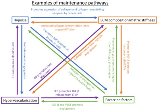 The aberrant and leaky vasculature is associated with an increase in interstitial fluid pressure (IFP). This pressure leads to the compression of blood and lymphatic vessels, limiting blood flow and increasing microvascular pressure. The loss of interstitial fluid pressure with therapy has been observed as a possible marker for therapy response [71].