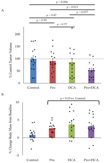 2.5. The Combination of Propranolol and DCA Delays Tumor Growth In Vivo