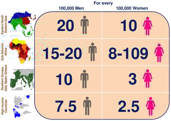 HCC around the world. Incidence rates of HCC in Eastern/South Eastern Asia, Sub-Saharan Africa, Southern Europe, Italy, Spain, Greece and high-income countries per 100,000 men and women.