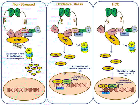Nrf2 is the primary governor of the antioxidant response pathway [85]. During normal physiological conditions, Keap1 acts as a negative regulator of Nrf2 and maintains a basal level of Nrf2 in the cytoplasm by degradation through the ubiquitin-proteasomal system. In contrast, the level of Nrf2 has been reported to be elevated during the stress conditions, primarily during oxidative stress. The Keap1 IVR domain cysteine residues act as redox sensor and when they get oxidized, the Nrf2 is disengaged from the regulatory complex [86]. Then, Nrf2 becomes phosphorylated and translocates into the nucleus as the nuclear localization signal sequences are exposed. Within the nucleus, the prime dimerizing partners-small v-maf musculoaponeurotic fibrosarcoma oncogene homolog (sMaf) proteins-accompany Nrf2. The Nrf2-sMaf heterodimers bind specific AREs within the DNA, which results in the recruitment of other transcriptional activators and triggers the transcription of Nrf2 target genes [87,88]. In HCC, this pathway may be enhanced and promotes cellular proliferation and progression. Thus, Nrf2 has been considered both as a tumour suppressor and an oncogene [89]. As it protects the cell from stress insults, Nrf2 is considered to be a tumour suppressor [90]. But during the initiation of cancer, oxidative stress persists, leading to the hyperactivation of Nrf2, which can then promote the survival of cancer cells [91]. During the course of its action in cancer cells, Nrf2 may also confer cellular resistance against chemotherapeutics and radiation therapy.