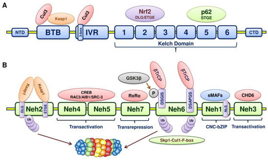 Keap1 is a Kelch-like (KLHL) protein, which belongs to the family of BTB-Kelch proteins. Keap1 complexes with Rbx1 and Cullin 3 (Cul3) and forms multicomplex Cullin-really interesting new gene (RING) ligases (CRLs) for polyubiquitination and subsequent degradation of Nrf2; thereby preventing Nrf2 translocation into the nucleus and binding of Nrf2 with antioxidant response elements (AREs) in the DNA. Similar to KLHL protein, Keap1 has three main domains with an N-terminal region (residues 1–49), a Broad complex, Tram-track, a Bric a brac (BTB) domain (residues 50–179), an intervening region (IVR) with residues 180–314, the double-glycine repeat or Kelch domains and carboxy terminal region (CTR) (residues 327–611) [67,68]. Being a substrate adaptor, with its BTB domain, Cul3 and Nrf2 are linked, the IVR domain binds Cul3 and the Kelch domain binds motifs in the Neh2 domain of Nrf2 (Figure 3).