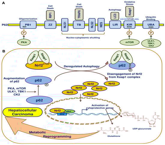 An impediment in autophagy induces post-translational modifications in p62 such as mTOR phosphorylation of S349 in the STGE motif (KIR domain) of p62, PKA phosphorylation of S24 of the PB1 domain of p62 and unc-51-like kinase 1 (ULK1), TANK-binding kinase 1 (TBK1) and casein kinase 2 (CK2) phosphorylation of S403 in the UBA domain of p62 [113]. All these phosphorylation events in p62 augment p62-Keap1 binding, ultimately resulting in the activation of Nrf2. Though these phosphorylation events are reported in different studies, the mode of activation of p62 in HCC was not studied in detail. Such future investigations will shed light on new therapeutic targets in HCC. The role of the Nrf2-p62 pathway in HCC has previously been reviewed in detail [114].