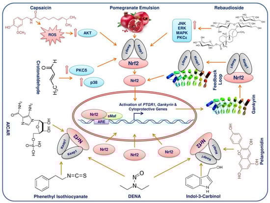 Phytochemicals such as phenethyl isothiocyanate, indole-3-carbinol, protocatechuic acid and tannic acid increased the expression of phase II enzymes (GSTA, GSTP, GSTM, GSTT and NQO1) and antioxidant enzymes (CAT, SOD, GR and GPx) in HepG2 cells [141]. This phase II and antioxidant gene expression was increased through activation of the Keap1-Nrf2-ARE signalling pathway. The induction was far more effective with phenethyl isothiocyanate and indole-3-carbinol than protocatechuic acid and tannic acid.