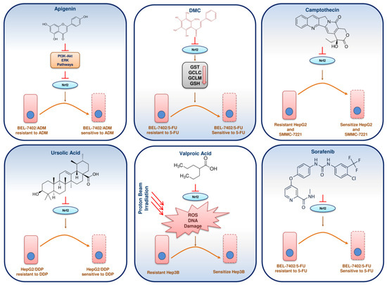 Chemotherapy resistance is a common threat in the treatment of HCC. Phytochemicals and molecules have the potential to sensitize chemoresistant HCC cells (Figure 6). Apigenin (4′,5,7-trihydroxyflavone) is a natural bioflavonoid that has exhibited anti-cancer properties against various cancers. The sensitivity of doxorubicin resistant HCC (BEL-7402/ADM) was enhanced by apigenin at non-toxic concentrations [146]. The cytotoxicity of BEL-7402/ADM cells was increased when apigenin increased the intracellular concentration of adriamycin (ADM). The PI3K/Akt pathway offers chemoresistance to cancers through Nrf2 activation. Apigenin, as an effective adjuvant sensitizer with ADM, inhibits the PI3K/Akt pathway and its downstream Nrf2 pathway, thus sensitizing the BEL-7402/ADM cells to ADM. Yet another natural flavonoid, chrysin (5,7-dihydroxyflavone) sensitizes ADM resistant BEL-7402/ADM cells to doxorubicin through inhibition of the PI3K-Akt and ERK pathways [147]. The inhibition of these pathways ultimately suppresses Nrf2 expression and reverses the drug-resistant phenotype in BEL-7402/ADM cells.