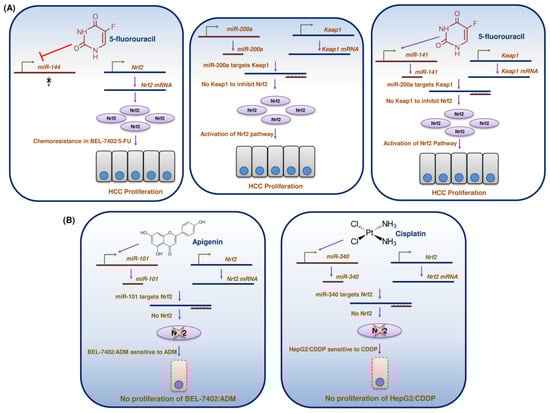 MiRs in the regulation of Nrf2 in HCC. MiRs either (A) activate or (B) suppress Nrf2, leading to chemoresistance and chemosensitization of HCC.