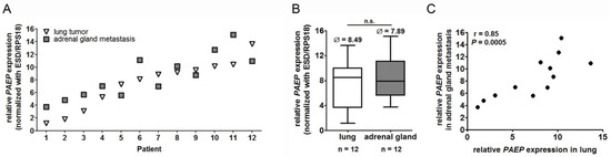 We first investigated the PAEP (glycodelin gene) and glycodelin (protein) expression in patients who underwent surgery for the excision of the primary tumor and adrenal gland metastases (Table 1). In general, we observed that PAEP was expressed on similar levels comparing the primary tumor and the metastasis (Figure 1A). However, the expression level of PAEP varied greatly in 12 patients. In the lung tumor of patient 1, it was approximately 4000 fold higher than in patient 12 (difference of 12 qPCR cycles). In line with that, the PAEP expression in the adrenal gland metastases was also very heterogeneous (Figure 1A,B). The PAEP gene expression between primary tumor and metastases was not significantly different (Figure 1B).
