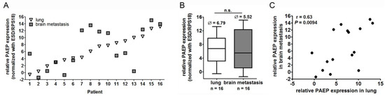 Glycodelin expression in primary tumors and brain metastases. 16 patient samples (primary lung tumors and brain metastases) were investigated for PAEP/glycodelin expression. (A) Relative PAEP gene expression (ΔCt) in primary tumors and brain metastases. Please note that a lower value means a higher gene expression. (B) Median expression levels of PAEP in NSCLC tumors and brain metastases. Ø: median (C) Nonparametric correlation analyses of PAEP gene expression. (D) Immunohistochemical tumor staining of 12 patients from (A) with a glycodelin specific antibody (FFPE tissue was not available for the other five patients). A representative area is shown. p < 0.05 was considered as significant. n.s. = not significant, PAEP = progesterone-associated endometrial protein, NSCLC = non-small cell lung cancer.