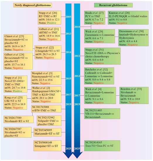 Timeline of phase III clinical trials in patients with newly diagnosed or recurrent glioblastoma. Almost all trials have been negative and failed to predict positive outcomes of the preceding phase II trials. α-IFN: interferon-alpha; Bevacizumab: anti-vascular endothelial growth factor (VEGF) antibody; Cediranib: an inhibitor of VEGF receptor; CIK: autologous cytokine-induced killer cells; Enzastaurin: an inhibitor of protein kinase Cβ (PKCβ, as well as PKCα, PKCγ, and PKCε at higher concentrations); IL13-PE38QQR, also known as Cintredekin besudotox: a recombinant chimeric cytotoxin composed of human interleukin 13 (IL-13) fused to a truncated, mutated form of Pseudomonas aeruginosa exotoxin A (PE38QQR); Marizomib: an irreversible proteasome inhibitor; mOS: median overall survival; Nimotuzumab: an anti-epidermal growth factor receptor (EGFR) antibody; Nivolumab: an anti-programmed cell death protein 1 (PD-1) antibody; NovoTTF-100A System™, or Optune™ generates Tumor Treating Fields (TTFields); PCV: procarbazine, lomustine, and vincristine; Rapamycin: an inhibitor of the mechanistic target of rapamycin (mTOR) protein kinase; RT: radiotherapy; Siroquine: sirolimus (rapamycin) plus hydroxychloroquine sulfate; ST: standard therapy; TMZ/ddTMZ: temozolomide/dose dense temozolomide; Toca 511: a gammaretroviral replicating vector encoding cytosine deaminase that converts the antifungal drug 5-fluorocytosine (FC) into the antineoplastic drug 5-fluorouracil (FU); VB-111: a non-replicating adenovirus 5 carrying a proapoptotic Fas-chimera transgene under the control of an endothelial cell-specific promoter; Veliparib: a poly(ADP-ribose) polymerase (PARP) 1 and 2 inhibitor. Cited literature: [1,2,3,4,21,22,23,24,25,26,27,28,29,30,31,32,33].