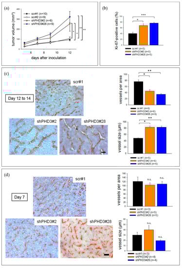 2.2. Reduction of PHD3 Leads to Accelerated Tumor Growth and Enlargement of Tumor Vessels