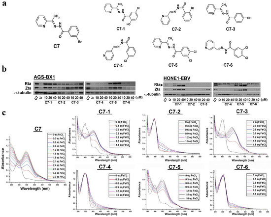 Effects of C7 and its structural analogs on Epstein–Barr virus (EBV) lytic cycle reactivation and the corresponding binding affinity of these compounds to Fe(III). (a) The chemical structures of C7 and its analogs obtained from ChemBridge Corp. (b) AGS-BX1 and HONE1-EBV cells were either untreated (U) or incubated with the C7 analogs at 10, 20 and 40 μM for 48 h and the expression of IE lytic proteins, Zta and Rta, was detected by Western blotting. Cellular α-tubulin was detected as a loading control. Treatment of AGS-BX1 cells with 10 μM C7 and HONE1-EBV cells with 5 μM C7 were included as positive controls. (c) Metal salt FeCl3 was added to 50 μM of C7 and C7 analogs from C7-1 to C7-6 in methanol in increments of 0.3 equivalents. Absorbance in the UV-Vis was measured after each addition until saturation was reached. Binding between C7/C7 analogs and FeCl3 was indicated by shift in peaks of the absorbance curve.